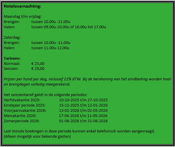 Wij bieden zowel vakantieopvang als dagopvang aan voor uw hond. Hieronder treft u de tijden aan van brengen en halen. Daarbij vind u een overzicht van de kosten voor de opvang. De kosten dienen vooraf overgemaakt te worden op ons rekeningnummer NL85 SNSB 0927 0791 35 t.n.v. A.B. Bosschaart o.v.v. naam hond of doorgegeven kenmerk.